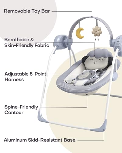 【ADORABLE LITTLE SHEEP DESIGN】The gray baby swing is adorned with cute little sheep toys, creating a charming and cozy animal world for your little one.