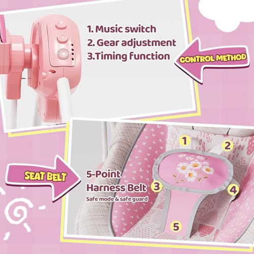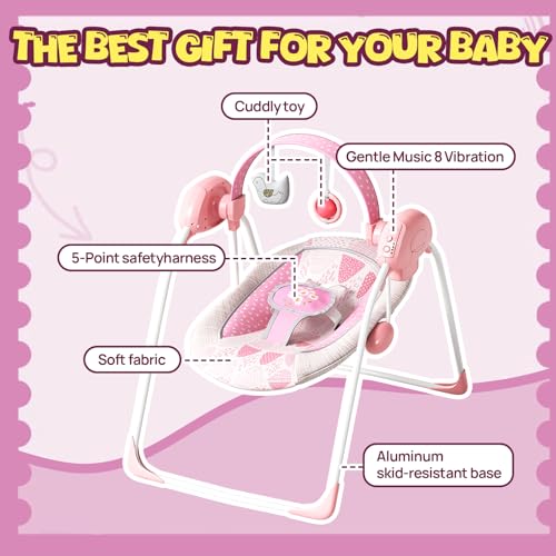 Portable Baby Swing, Pink Electric Infant Swing with 5 Speed Levels, 6 Songs & Timer – Battery-Powered Only (No Batteries Included) Pink and White