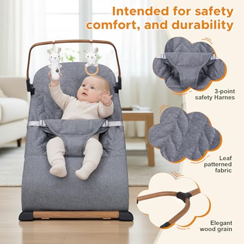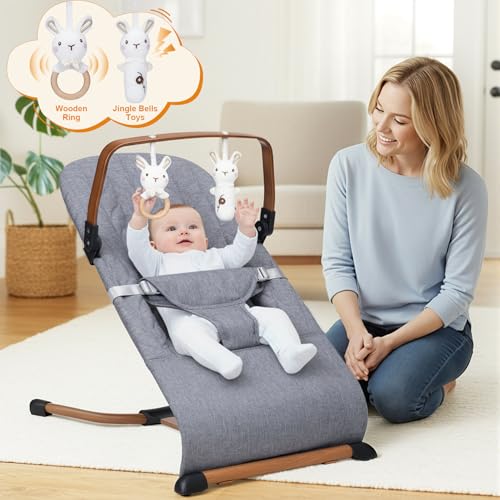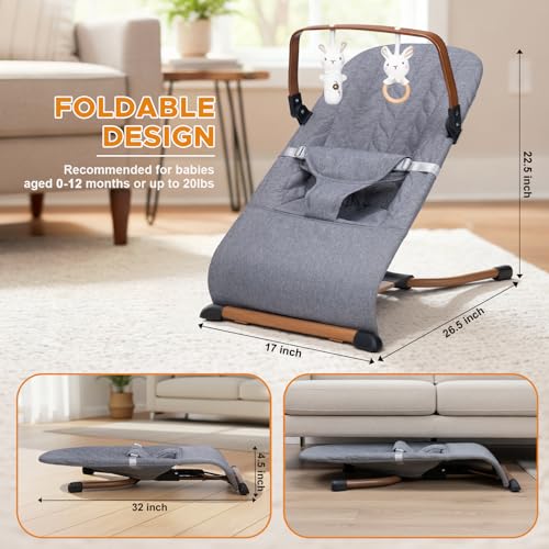 Portable Baby Bouncer, Bouncer Seat for Babies 0-12 Months, 3 Recline Positions, Foldable Baby Rocker Chair with Removable Wooden Bar, Gray