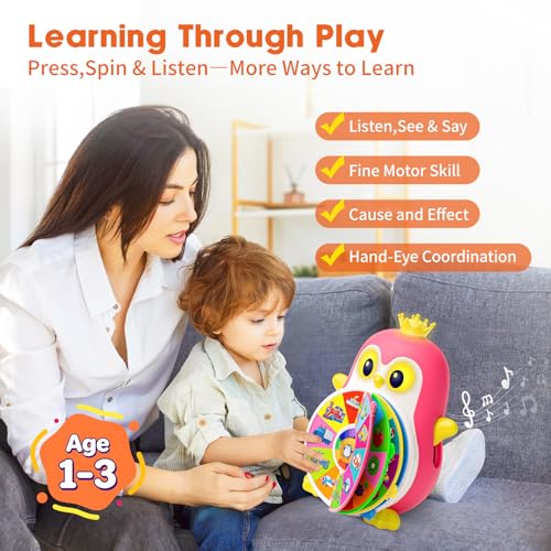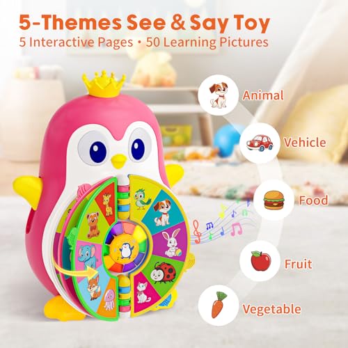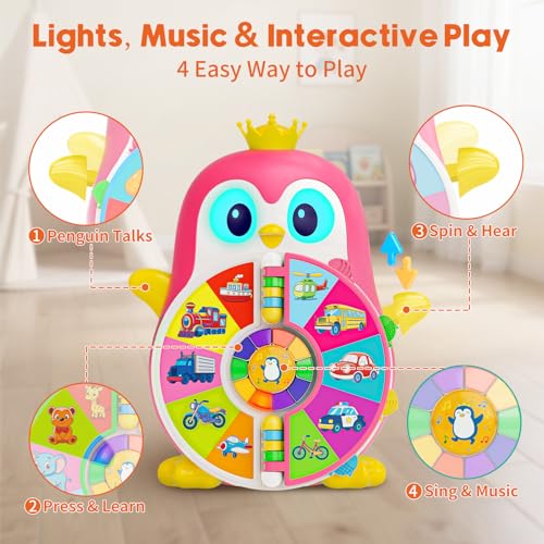 Interactive See & Say Discovery Play: Toddlers can pull Penguin’s left arm to spin the lights and randomly discover words, or press light buttons to hear related sounds and phrases — keeping little hands busy with interactive play and turning learning into a fun surprise every time.