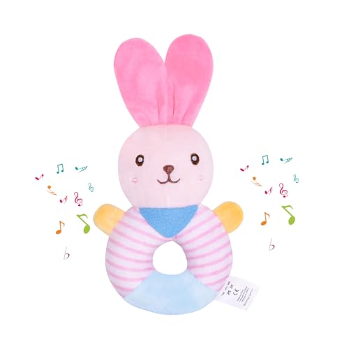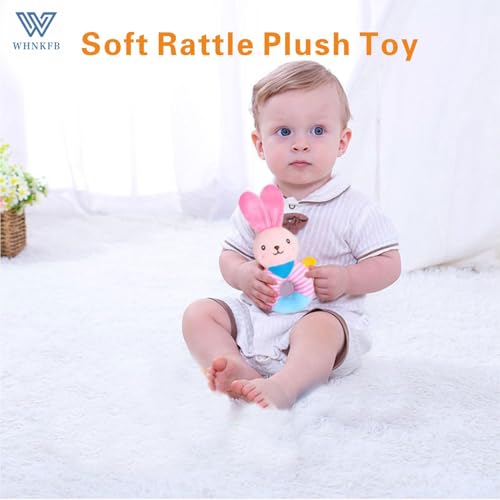 Stimulate Sensory Development: Designed for 0-12 months infants, this bunny plush baby rattle toy features crinkle ears, gentle squeaker, and soft textures to enhance auditory, tactile, and visual exploration during tummy time.