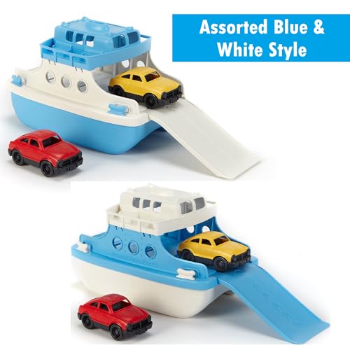 The Green Toys Ferry Boat sports a fun blue-and-white design and two colorful cars that will delight young children. It also features a spacious cargo area and a slide-out ramp. The open design also allows children to place action figures or other toys inside.Just like a real ferry, the toy is designed to float in water. The pontoon-inspired design keeps the vessel steady and helps prevent rolling. Your little one will love taking this boat for adventures and driving the included mini cars up and down the ramp during bath time or at the pool or beach.
