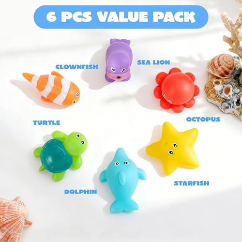 Bath Toys Sea Animals Package Content: The set includes 6 sea animal designs—Clown Fish, Sea Turtle, Octopus, Dolphin, Starfish, and Whale. Ideal for bath toys for children, toddlers, and young kids.