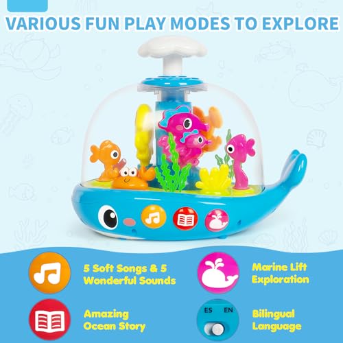 Multi-Functional Baby Toys with Light & Music: Our development infant musical toy features 5 playful sound effects, 5 upbeat songs, and rhythmic whale melodies activated by easy-press buttons. Immerse your babies in the ocean world to the rhythm of the music! Perfect toy for 6 7 8 9 11 12 months boy and girl to develop listening skills, sound recognition, and early musicality