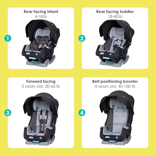 4-in-1 seating system built for extended use including: 1. Rear Facing Infant mode from 4 to 18 lb, 2. Rear Facing Toddler mode from 18 to 40 lb, 3. Forward Facing with Harness mode from 30 to 65 lb, 4. Belt Positioning Booster mode from 40 to 100 lb.