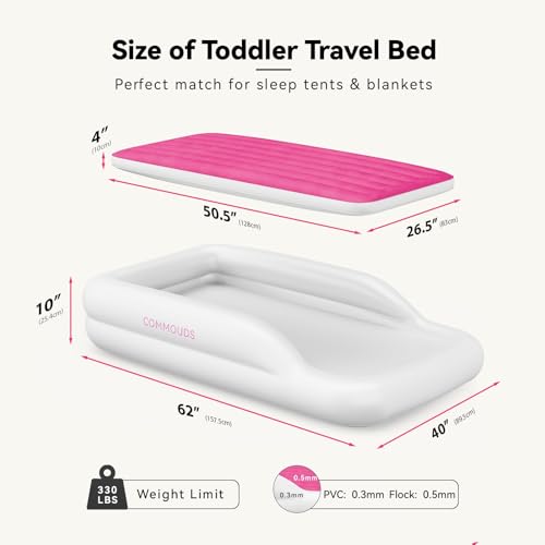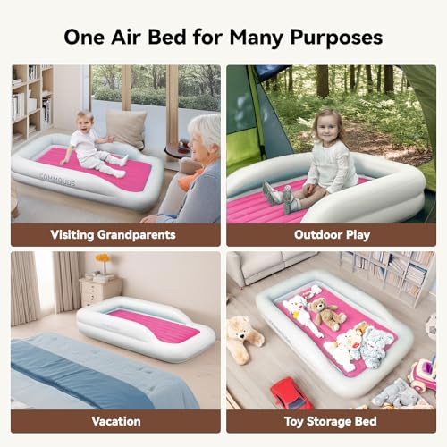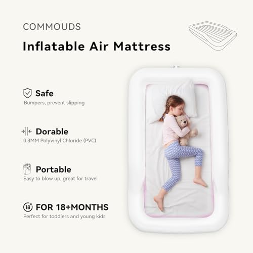 COMMOUDS Portable Toddler Travel Bed with Safety Bumpers, Inflatable Kids Air Mattress with Electric Pump, Baby Blow up Mattress, for Grandma’s Home Camping Vacation