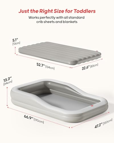 QPAU Inflatable Toddler Travel Bed with 3-Sided Safety Bumpers, Extra Large Kids Air Mattress, Includes Detachable Mattress, Portable for Camping, Travel, Home Use (Grey)