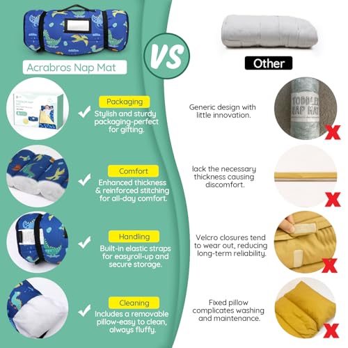 Versatile Use: The Acrabros toddler nap mat with pillow is ideal for daycare, preschool, and special centers. Convenient and equipped with a transparent name card, it’s also perfect for home, camping, outdoor activities, and picnics