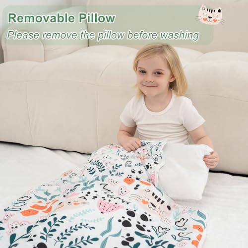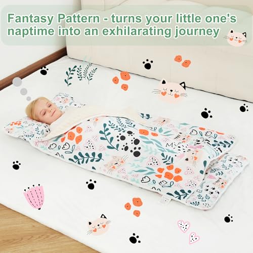 Viviland Toddler Nap Mat with Pillow and Minky Dot Blanket, Rolled Sleeping Mats/Slumber Bag, Large Thick Kids Nap Mat for Preschool, Daycare, Kindergarten, Travel Camping -Cute Cat