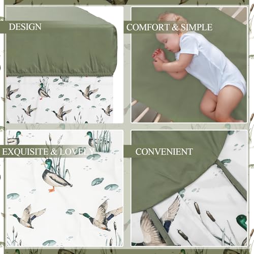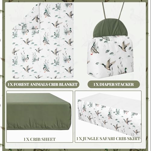 Oudain 4 Piece Mallard Duck Crib Bedding Set Including Mallard Duck Crib Skirt, Blanket, Crib Sheet and Diaper Stacker, Soft Neutral Nursery Standard Size Baby Bedding for Baby Girls and Boys