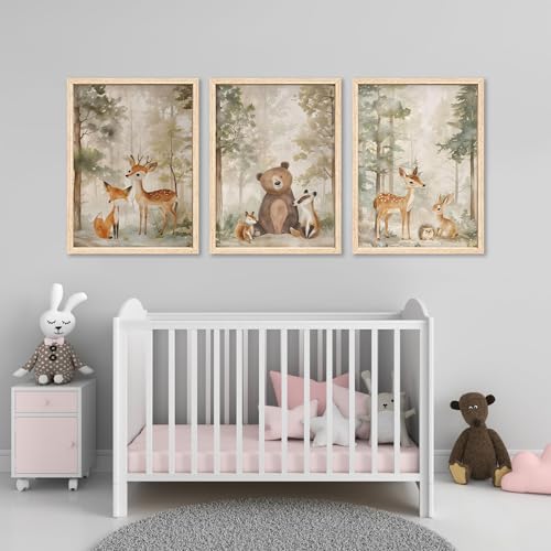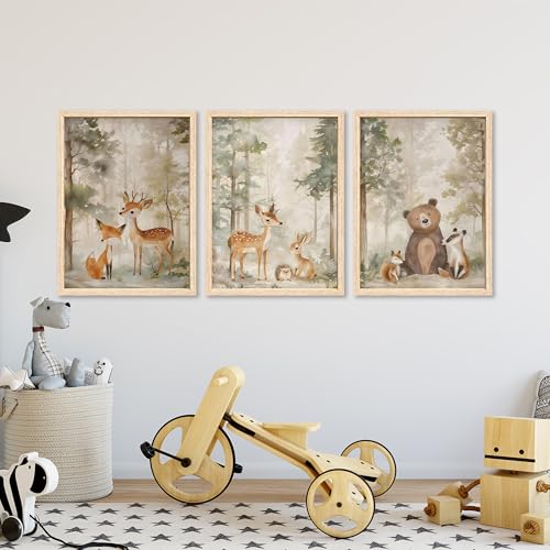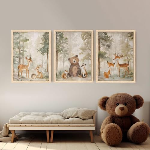 ICHZUMW Woodland Nursery Decor Wall Art Set of 3, Cute Forest Friend Animal Canvas Prints Bear Fox Deer Pictures, Nature Watercolor Paintings, Baby Room Kids Bedroom Playroom, Neutral Artwork 12x16in