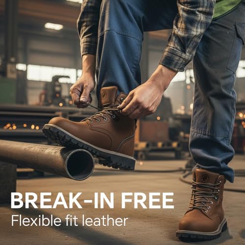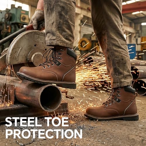ANGRYRAM Steel Toe Boots for Men 6 Inch Leather Work Boots for Men Sturdy Slip Resistant Waterproof Steel Toe Construction Safety Shoes Lightweight Comfortable