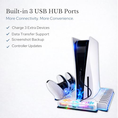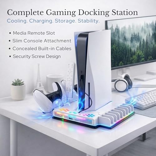 Multifunctional Design – This playstation 5 cooling station is compatible with PS5 Digital/Disc console/PS5 Slim/PS5 Pro with a replacement holding part for other consoles. All-in-one cooling, storage, and charging dock with a secure locking screw, safely charging two DualSense controllers while keeping accessories organized.
