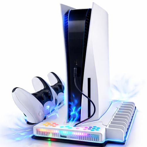 PS5/Slim/Pro Cooling Station & Stand for Disc & Digital Console – PS5 Charging Station with RGB Lights – PS5 Controller Charger Built-in 3 Level & Adjustable Fan – PS5 Accessories