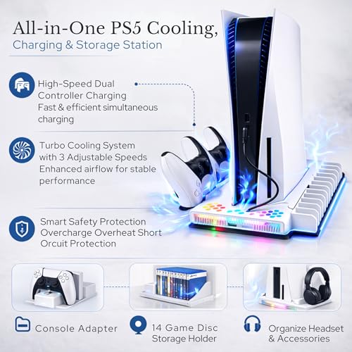 Specification: PS5/Slim/Pro Cooling Station & Stand for Disc & Digital Console – PS5 Charging Station with RGB Lights – PS5 Controller Charger Built-in 3 Level & Adjustable Fan – PS5 Accessories