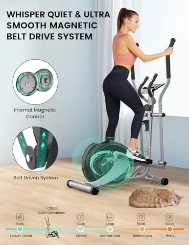 【Ultra-Silent & Smooth Operation】The THERUN elliptical machine for home features a newly upgraded 13.2 lb internal magnetic flywheel, delivering smoother, more consistent resistance than traditional external systems. It operates at just 20 dB—even after extensive use—ensuring a fluid, whisper-quiet workout without disturbing your household or neighbors