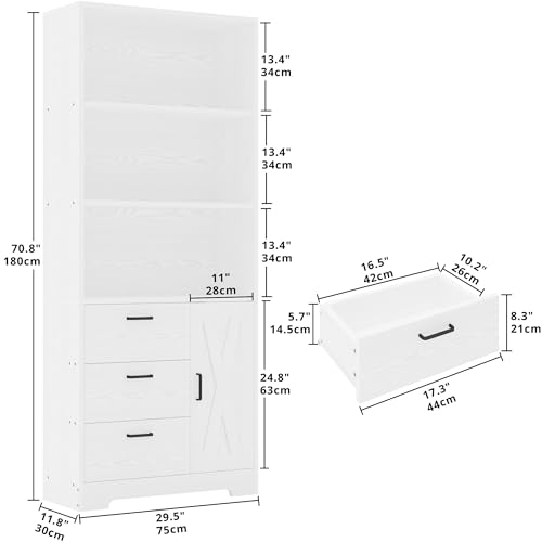 Specification: IRONCK Bookshelf with Drawers, 71 in Tall Bookcase with Doors and 3-Tier Shelves, for Bedroom Living Room Entrance Hallway Home Office