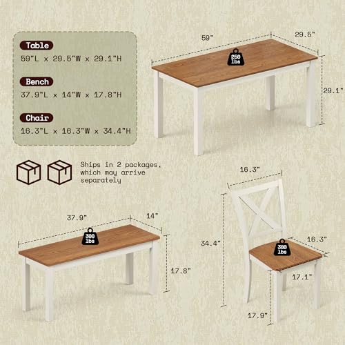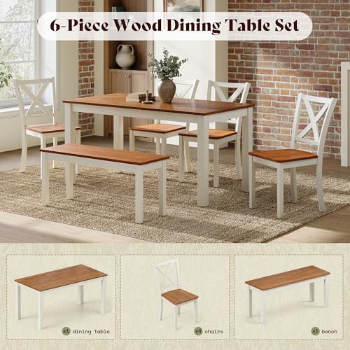 Specification: AMERLIFE 6-Piece Farmhouse Dining Table Set, 59″ Wooden Table with 4 Chairs & Bench, Kitchen & Dining Room Set for 6, Space-Saving Rustic Dining Set, Walnut & Beige