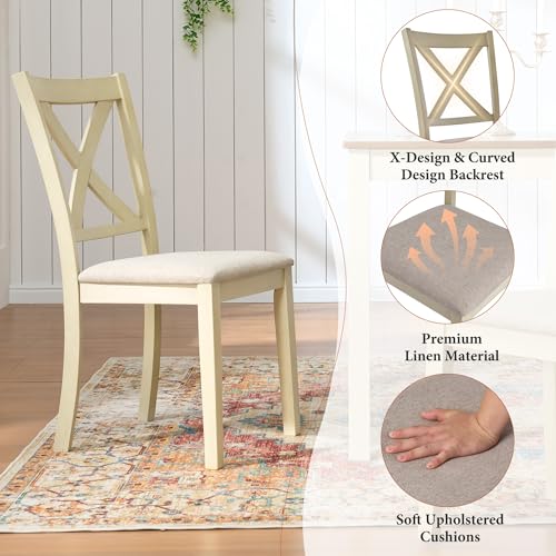 AMERLIFE 7-Piece Farmhouse Solid Wood Dining Table Set with 6 Upholstered Chairs, 60″ Space Saving Dinner Table & Chairs Set, for Dining Room, Kitchen, Restaurant, Rustic Cream