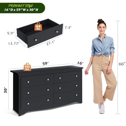 Specification: WLIVE Black Wooden Dresser for Bedroom, 6 Drawers Chest of Drawers, 59″ Wide Modern Dresser Closet Storage Organizer for Living Room Hallway