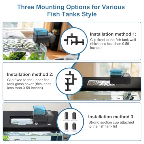 【Multiple Installation Methods for All Aquariums】Three installation options fit various aquarium setups. The adjustable clamp mounts firmly on the tank wall or lid, compatible with thicknesses from 0 to 0.59 inches. Four strong suction cups are also included for easy, secure installation. These multiple mounting methods offer great flexibility and convenience for feeding your fish anytime, anywhere